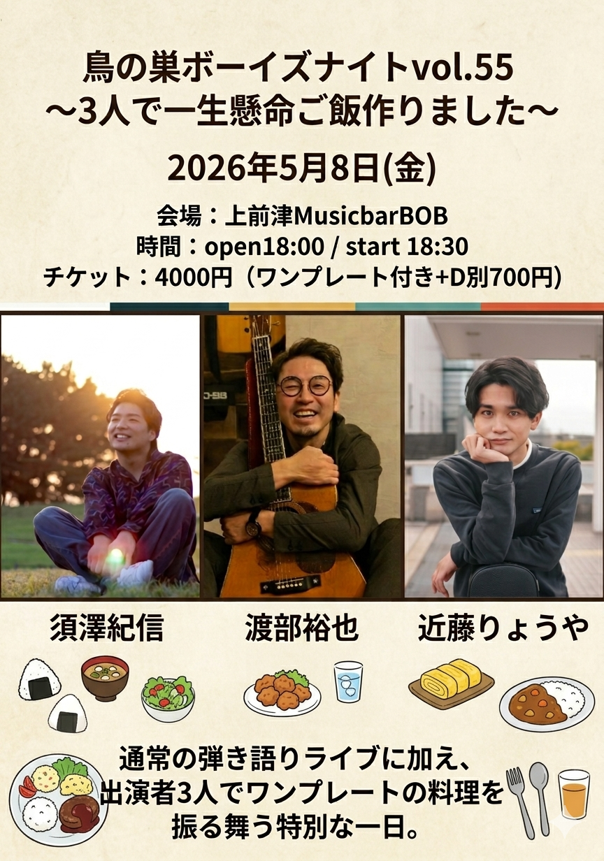 『鳥の巣ボーイズナイトvol.55~3人で一生懸命ご飯作りました~』