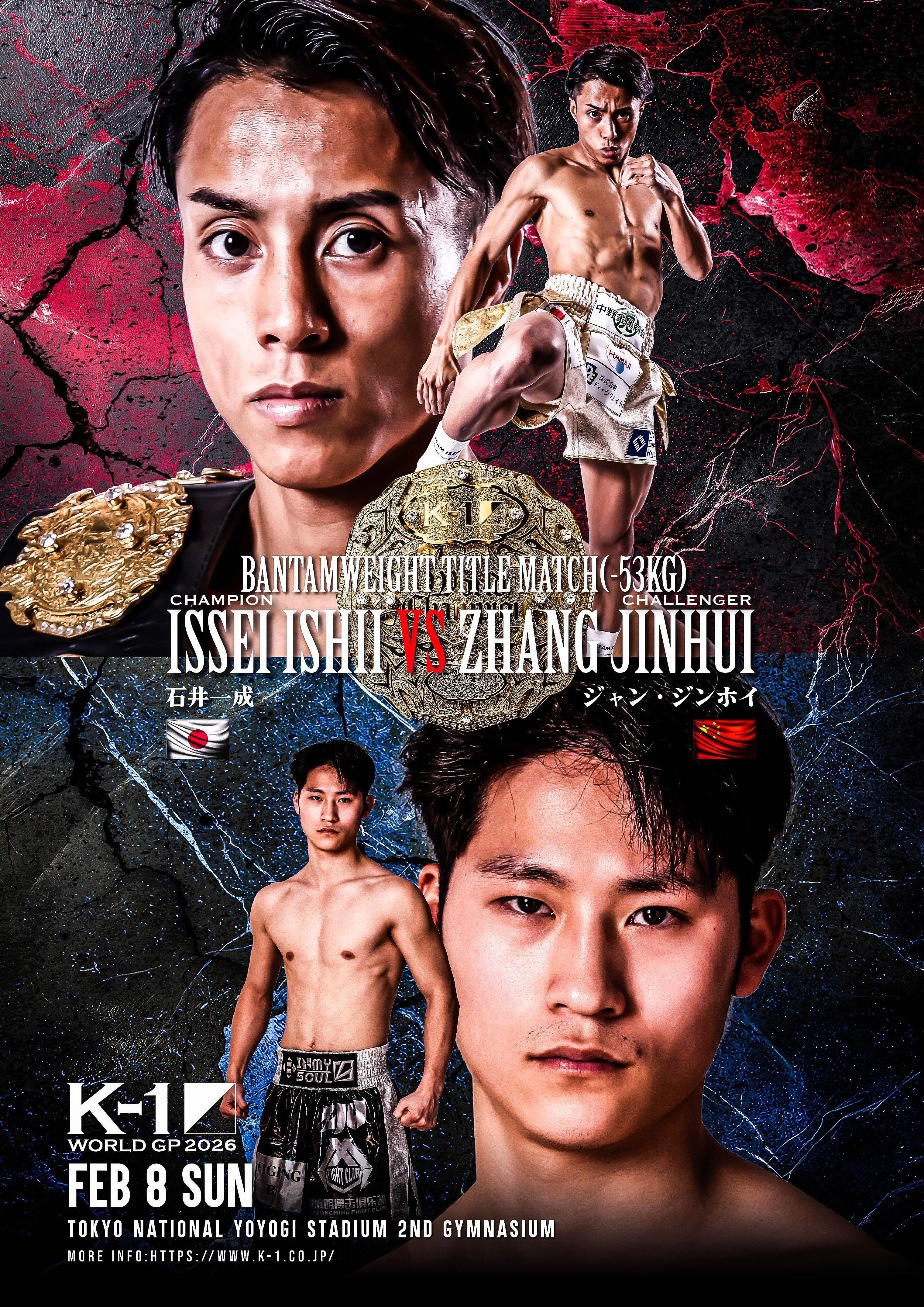 2月8日(日) に開催の『K-1 WORLD GP 2026~-90kg世界最強決定トーナメント~』(東京・国立代々木競技場第二体育館)でK-1 WORLD GPバンタム級タイトルマッチに出場が決定していたK-1バンタム級王者・石井一成(日本/ウォーワンチャイプロモーション)の初防衛戦の対戦相手が、中国・武林風が送り込む20歳の新鋭 ジャン・ジンホイ(中国/リュウ・シャンミンファイトクラブ/CFP)に決定!