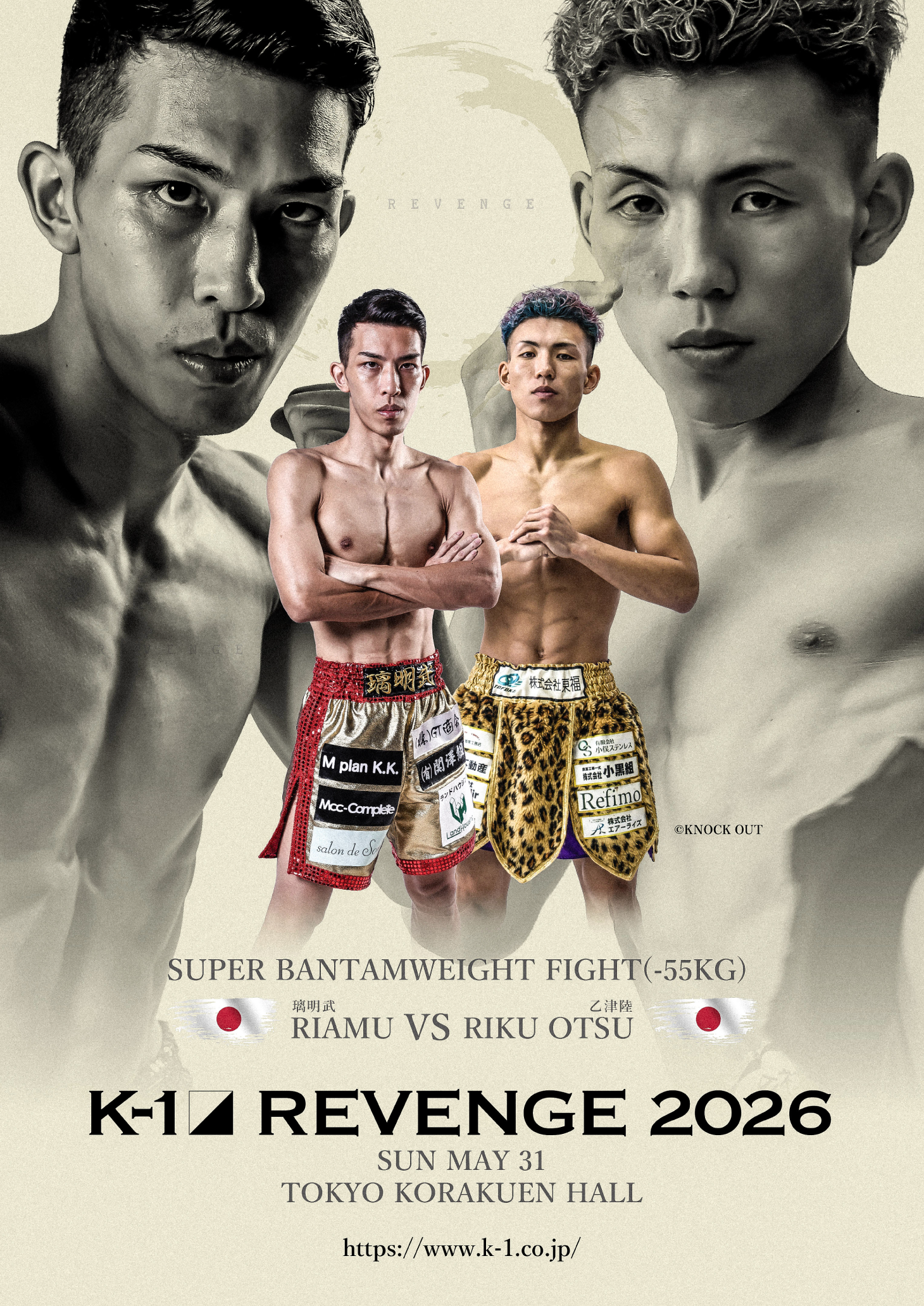 2026年5月31日(日)、東京・後楽園ホールで開催される『K-1 REVENGE』の[K-1スーパー・バンタム級/3分3R・延長1R]で、璃明武(日本/K-1ジム総本部チームペガサス)と乙津陸(日本/KNOCK OUTクロスポイント大泉)の試合が決まった。