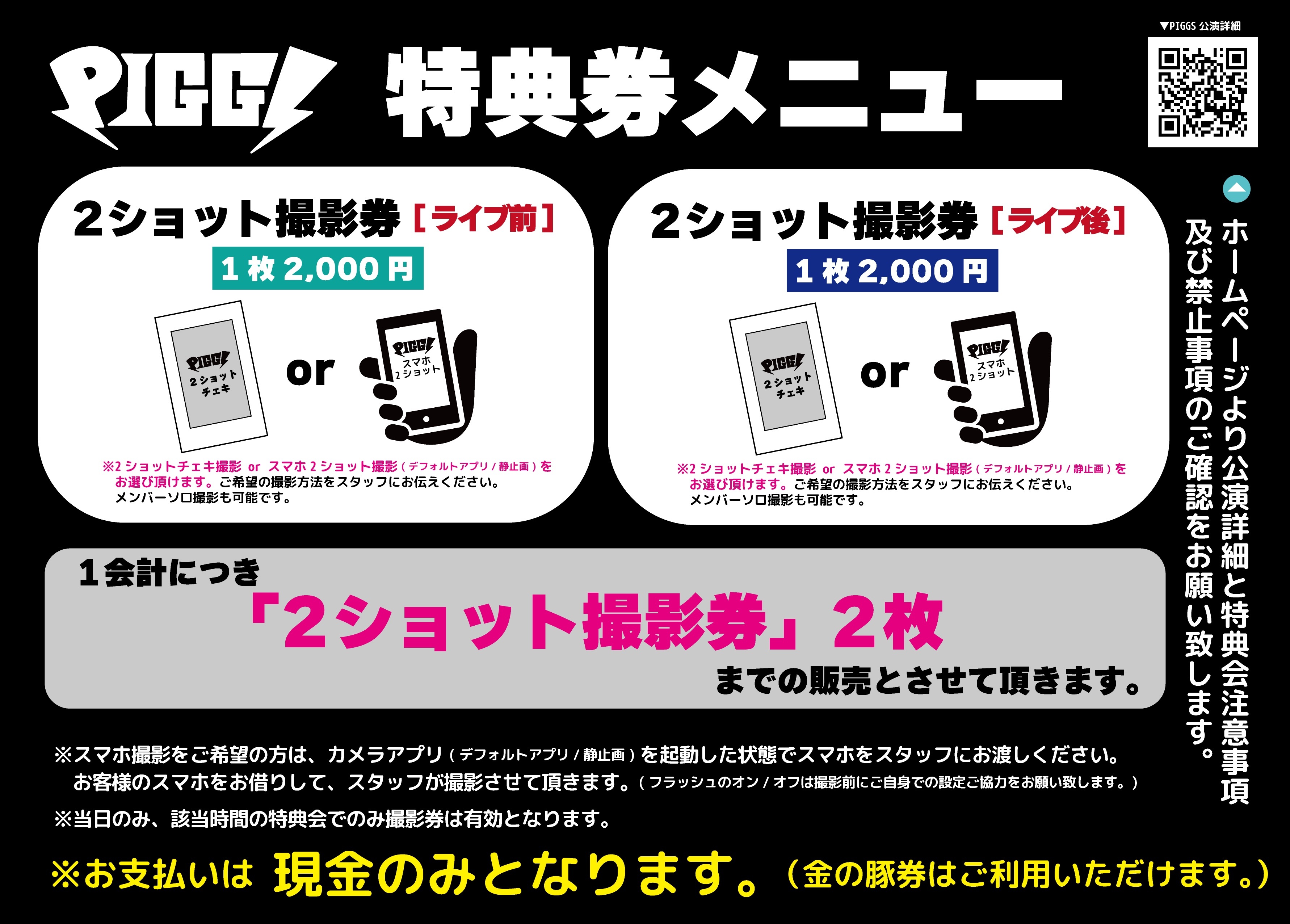 ●PIGGSのライブ中は静止画のみ撮影可能となりますが、イベントによってライブ中の写真撮影ができない場合もございます。イベント毎の注意事項・会場でのアナウンスのご確認をお願い致します。