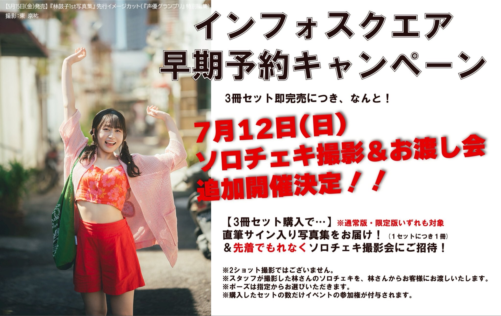 NEW 「林鼓子1st写真集(仮)」 早期予約イベントの追加開催が緊急決定! 2026.03.29 NEWS 『林鼓子1st写真集(仮)』5月15日(金)発売 大反響&3冊セット即完売により早期予約イベントの追加開催が緊急決定!7月12日(日) ソロチェキ撮影&お渡し会 4月5日まで先着で受付中 https://infosquare.shop/?pid=191134624