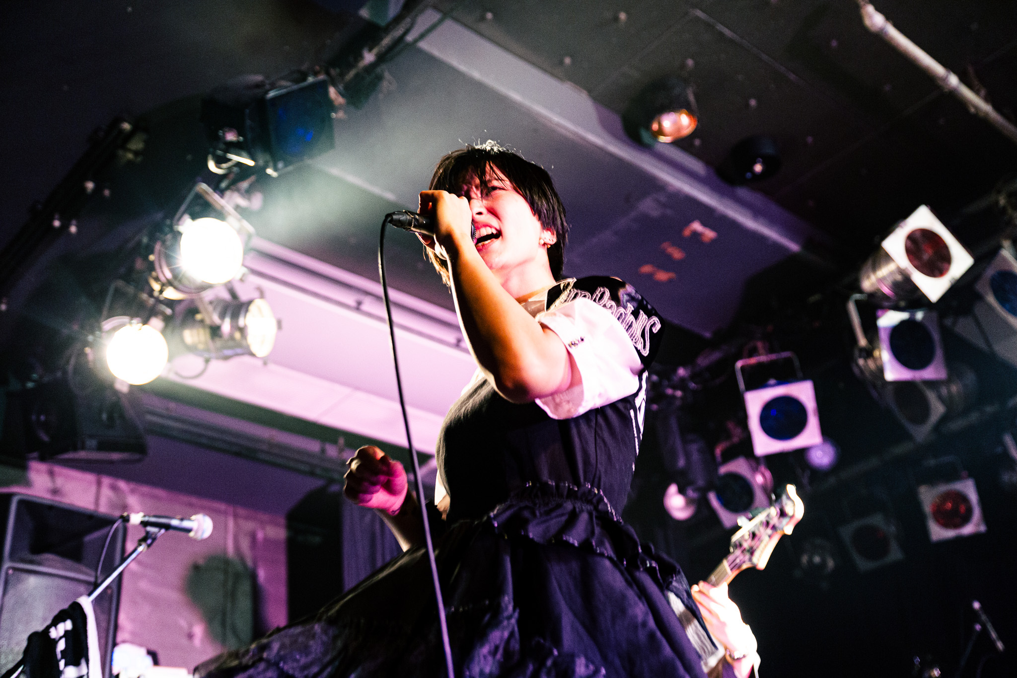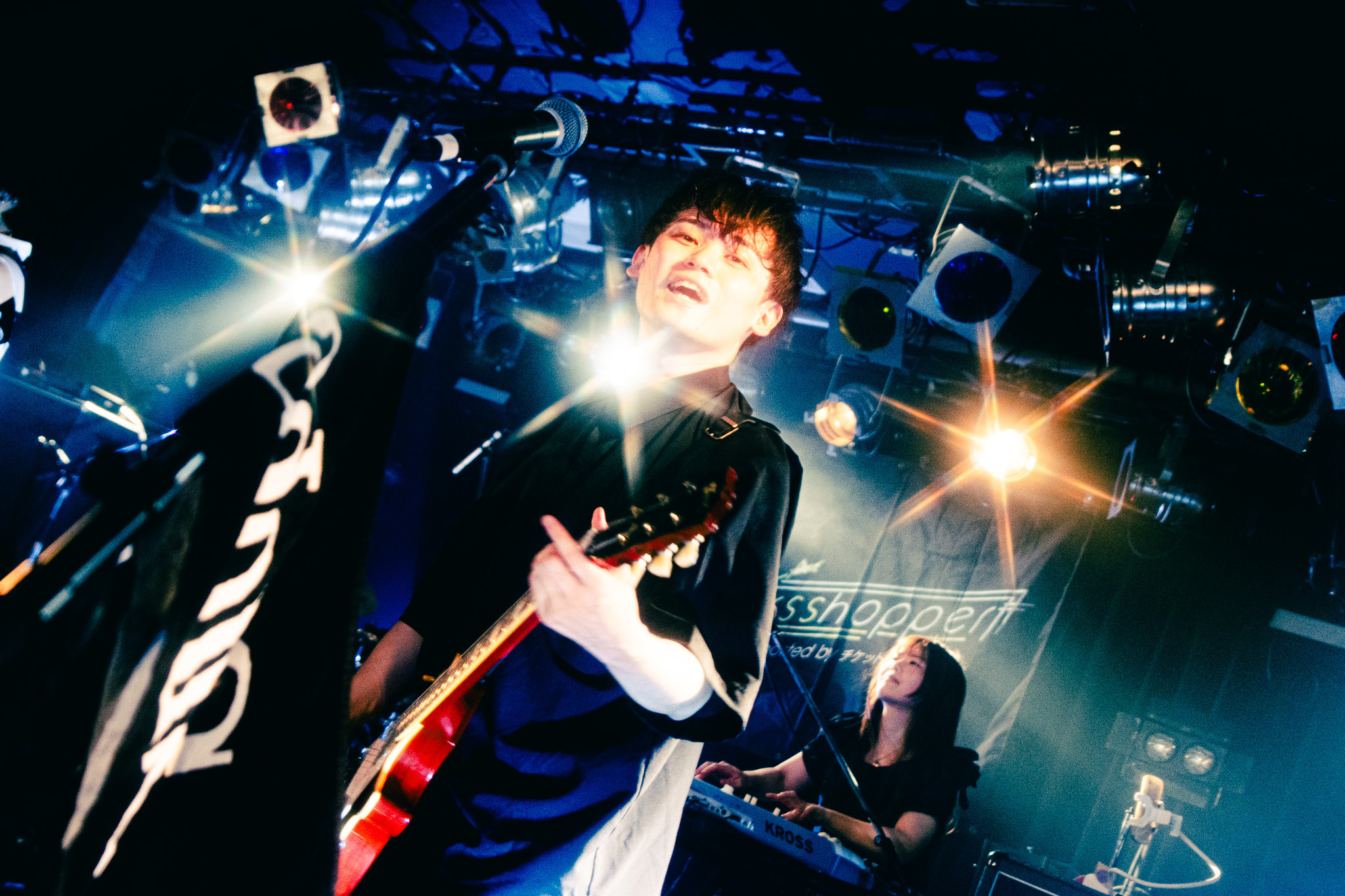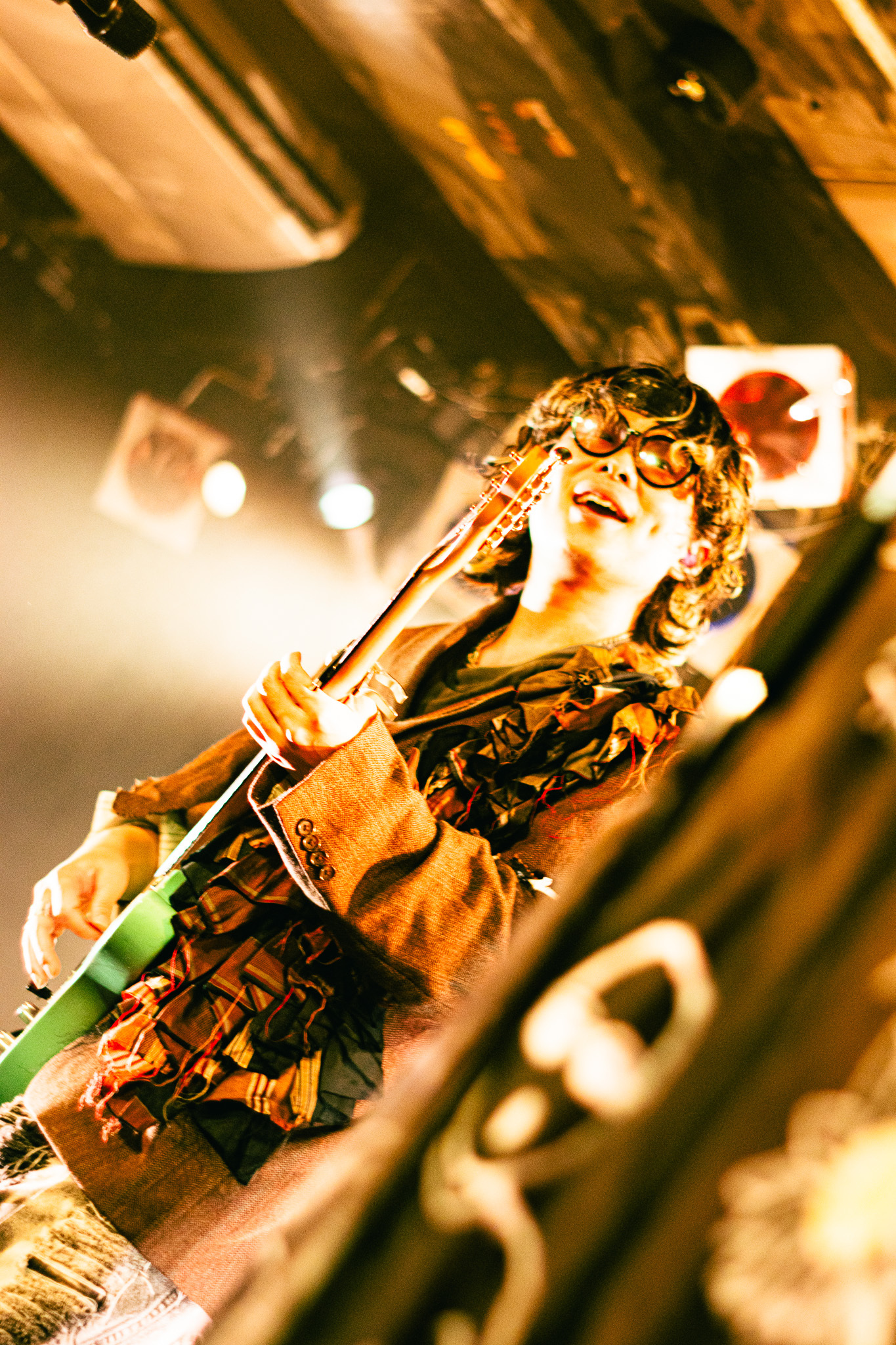 今度は青木がダンディーなギターソロで繋ぎ、「踊ってくれよ渋谷O -Crestー!」と五十嵐が叫んで、『赤ずきんはエンドロールの夢を見るか?』を始めると、会場も「オイ!オイ!」と声を出す。止まらないクラップとサビでのシンガロングも含めて、何だかステージの5人とフロアの熱狂対決にも見えてきた。五十嵐もギターをライフルのように構えて応戦していた。続くは『ロールシャッハの数奇な夢』。より複雑に絡み合う音圧がいろんな方向で迫ってきて、最後は全員で「ヘイ!」。さすがにこれはフロアも操られた感じもあって、うーんこの熱狂対決はポンバズの勝ち!しかし五十嵐も地声で「ありがとうー!」と叫んだところを見ると、とてつもない熱戦だったであろう。