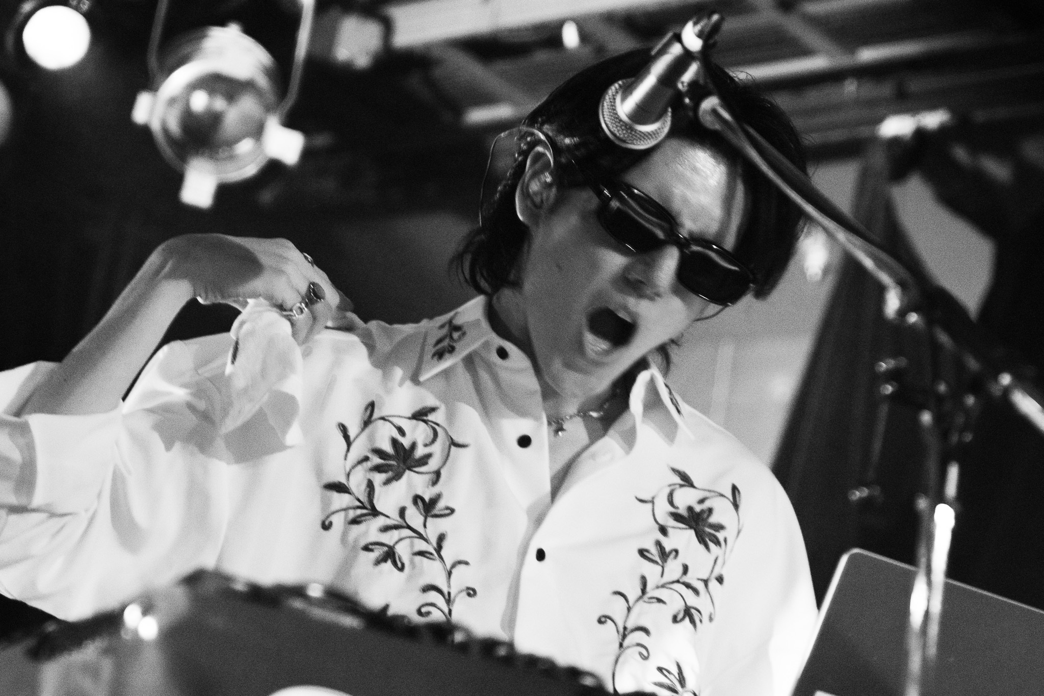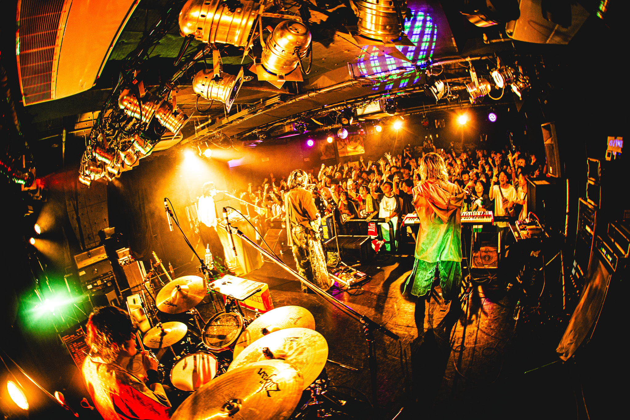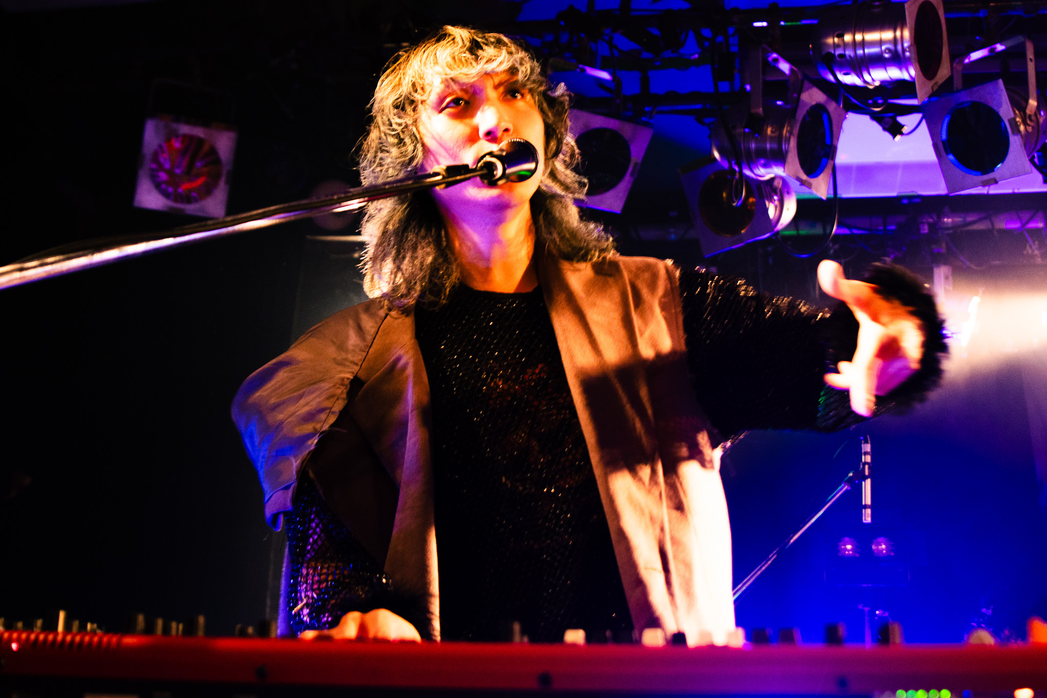 まだ2曲目だが、この時点でサウンドの幅広さと、3人のボーカルによる自由自在な歌割りに驚く。各々1人で歌うこともあれば、3人でもあるし、2人で歌う時の組み合わせも度々変わる。そして3人ともボーカリストとしての能力が高いから歌い方も様々。音楽の枠の無さ、色彩の豊かさに酔いしれてしまった。加えてこの曲が都会の夏祭りっぽい洒落たビートだから酔いも早く回ってしまう。そんなのもお構いなしにマサが「かかってこいよクレストー!」と叫んで『ぐーぐーぐー』『色欲』をノンストップで重ねるもんだから、暴れる鼓動のど真ん中、狂わされて蕩けます。そんな丸裸で楽しむフロアを見て「調子良さそうですね、皆さん!」と3人も上機嫌そう。いや楽しくパフォーマンスするステージを見てると、フロア側ももっと踊らなきゃ!って本能的に思うんですよ。加えて成瀬のブレないリズムカルなドラムがサウンド全体を引き締めているのも、安心して身を委ねるポイントの1つになっている。『色欲』の最後はマサが囁くように歌って終わるのもクール。大きな歓声と拍手が起こった。