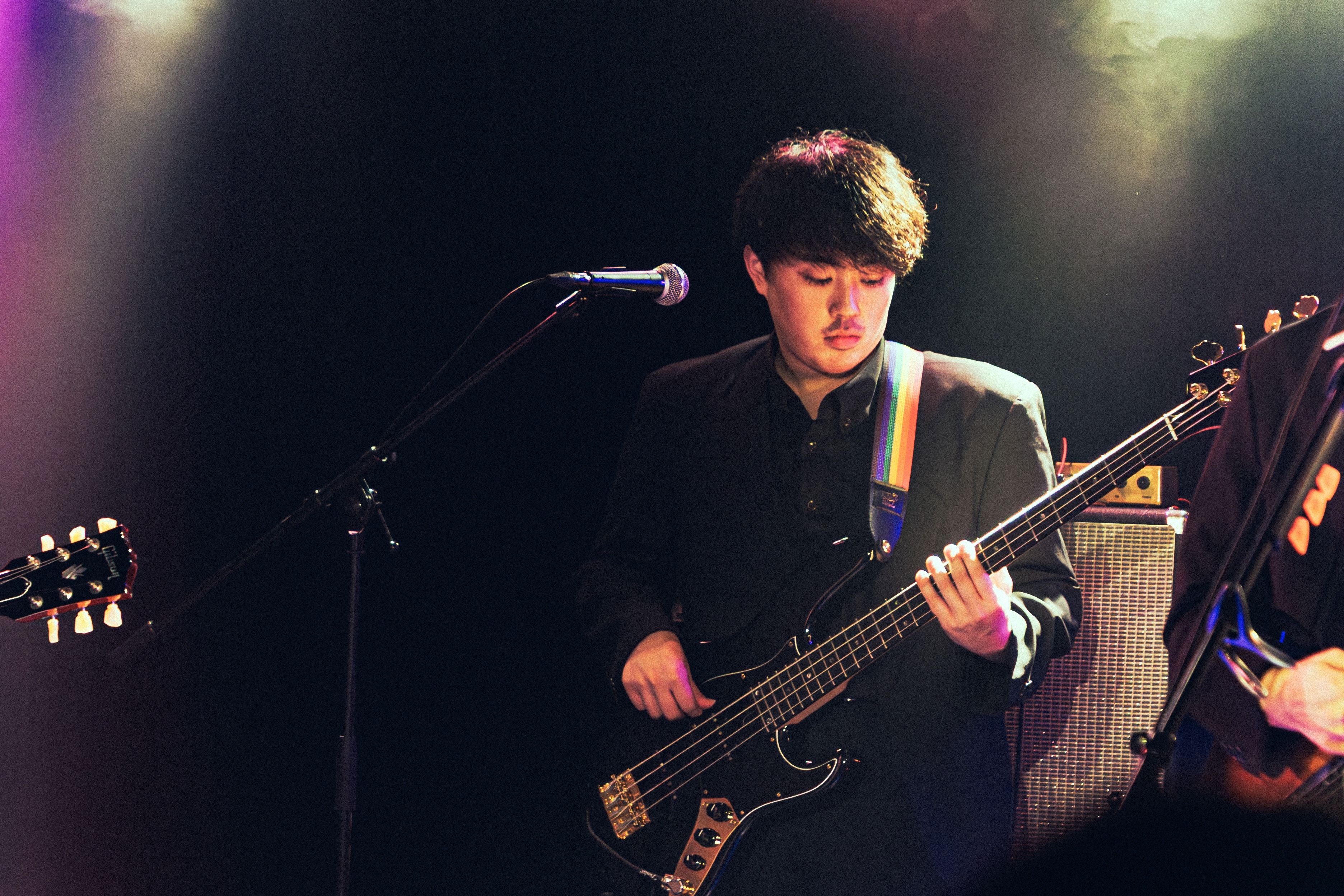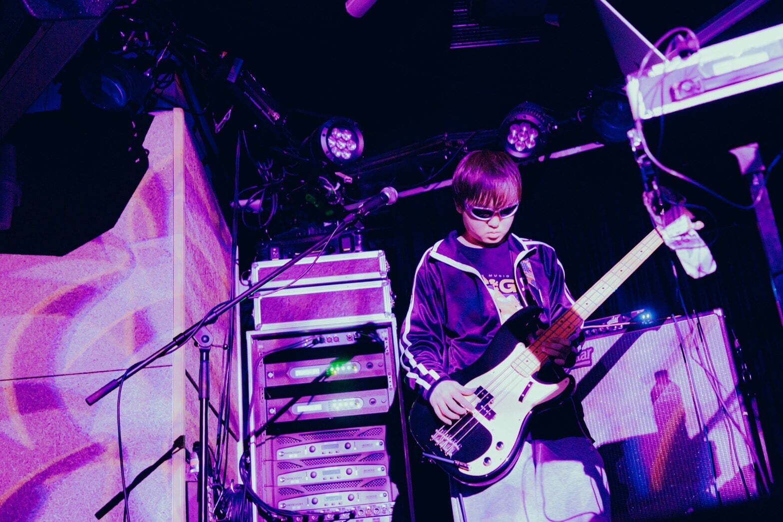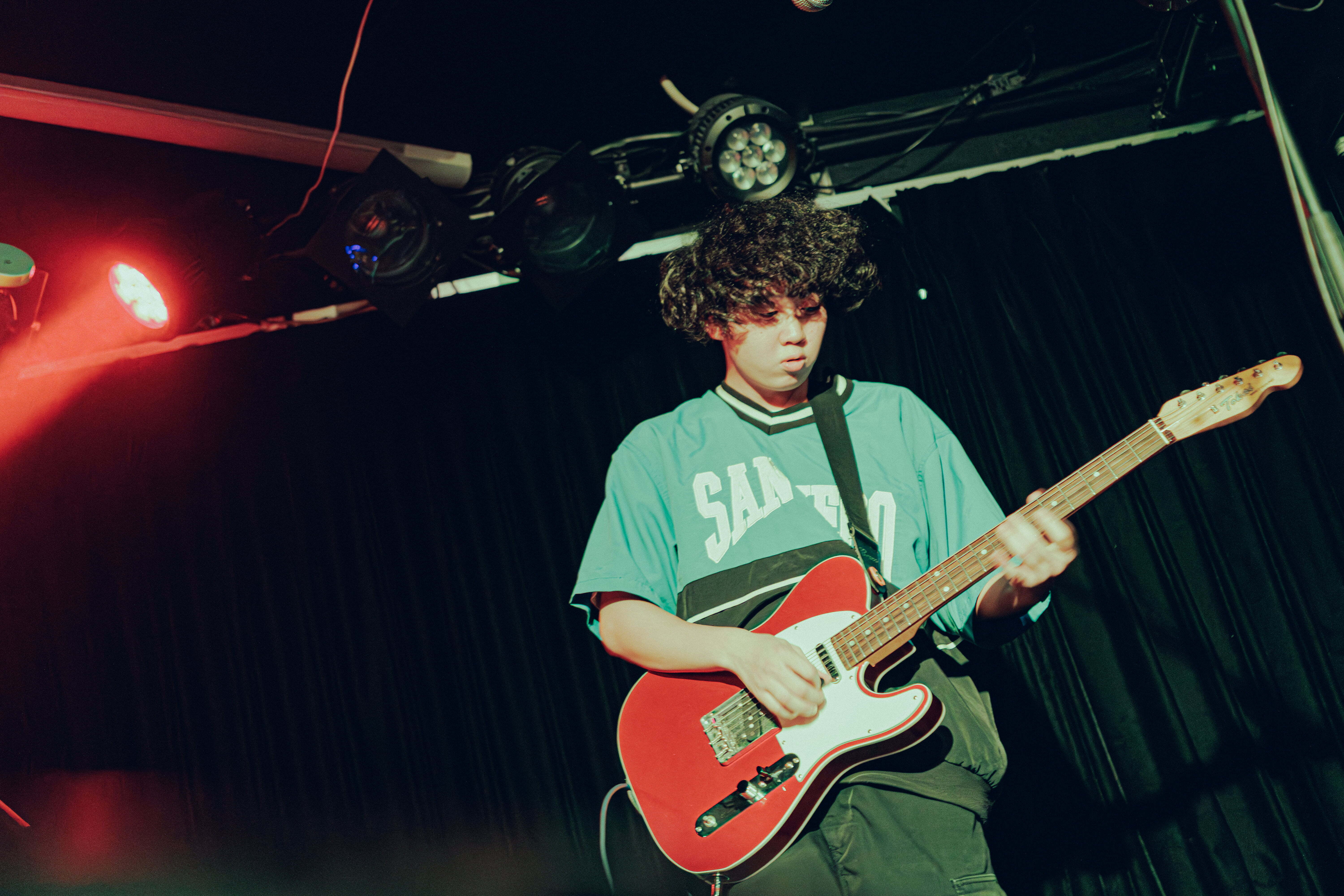 イベントのスタートを切ったのは、Pastel Tang Club。黒で統一された衣装でステージに登場した5人は、1曲目の「Lonely Girl」からブーストをかける。メロディの疾走感とギターのカッティングが気持ち良く、それでいて感情を曝け出すように絶唱するパートもあり、気持ち良さだけでは終わらせない。ストロボが視覚的にも攻撃性を増幅させる、音の粒が激流のように流れてきた「track jacket」では、スピード感も相まってオーディエンスの身体を揺らしていく。熱いパッションを感じるボーカルと、どこまでも自由なメロディワークが融合し、様々な表情を見せていくのが面白い。