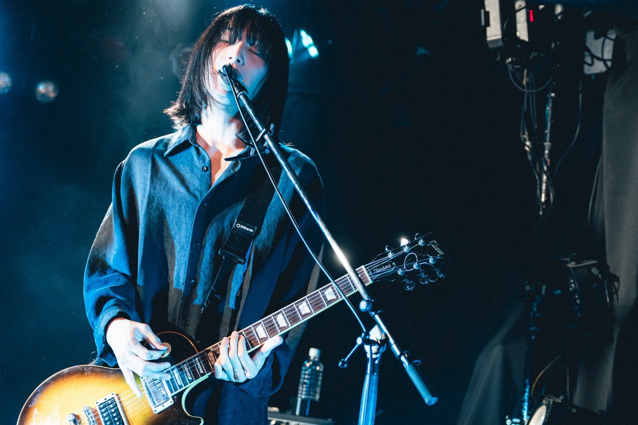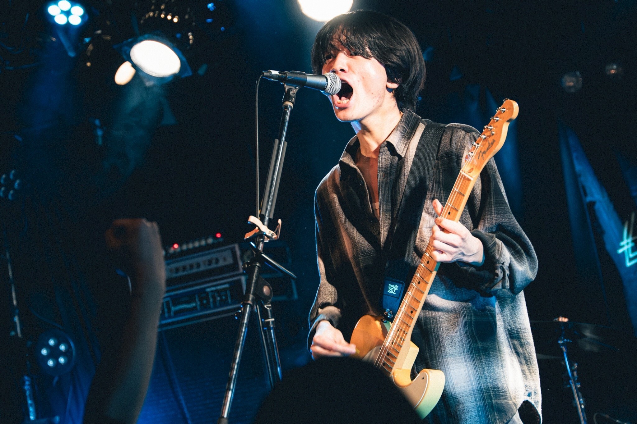 乗り越えた日々の数だけの夜があるし、生き延びている人の数だけの夜があって、そうしていくつもの闇の中から仄かな月光をかき集めたら、高出力のアンセムになった。「ライブを重ねるとだんだん歌が上手くなって、初めて曲を作った時のぎこちなさが思い出せなくなってしまうんです。今日は、この曲を作ったあの時の感情を思い出しながら歌います」。Genta(Gt&Vo)がそう語り「青春の中で」を歌い出した瞬間、星空が広がるように全方位が彼らの世界観に染まる。いつか来る終わりを恐れ、躊躇う歩みのようなスロービート。それでも僕らは、前に進むことしかできない。
