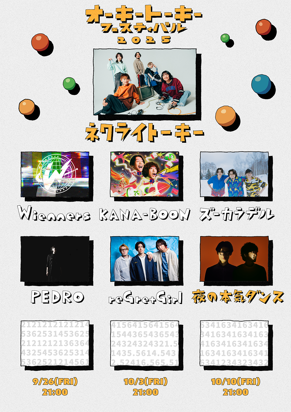 【新規公演】11⽉16日(日) 豊洲PIT「オーキートーキーフェスティバル2025」 2025.09.19 NEWS 「オーキートーキーフェスティバル2025 」【 開催日時 】2025年11⽉16日(日)開場 12:00 / 開演 13:00【 開催場所 】豊洲PIT【 出演 】 ネクライトーキー / Wienners / KANA-BOON / ズーカラデル / PEDRO / reGretGirl / 夜の本気ダンス【 チケット 】前売 ¥9,000 + 1Dグッズ付きチケット ¥15,000 + 1Dオフィシャル先行:8月28日(木) 21:00 - 9月21日(日) 23:59https://l-tike.com/okeytalkiefes/