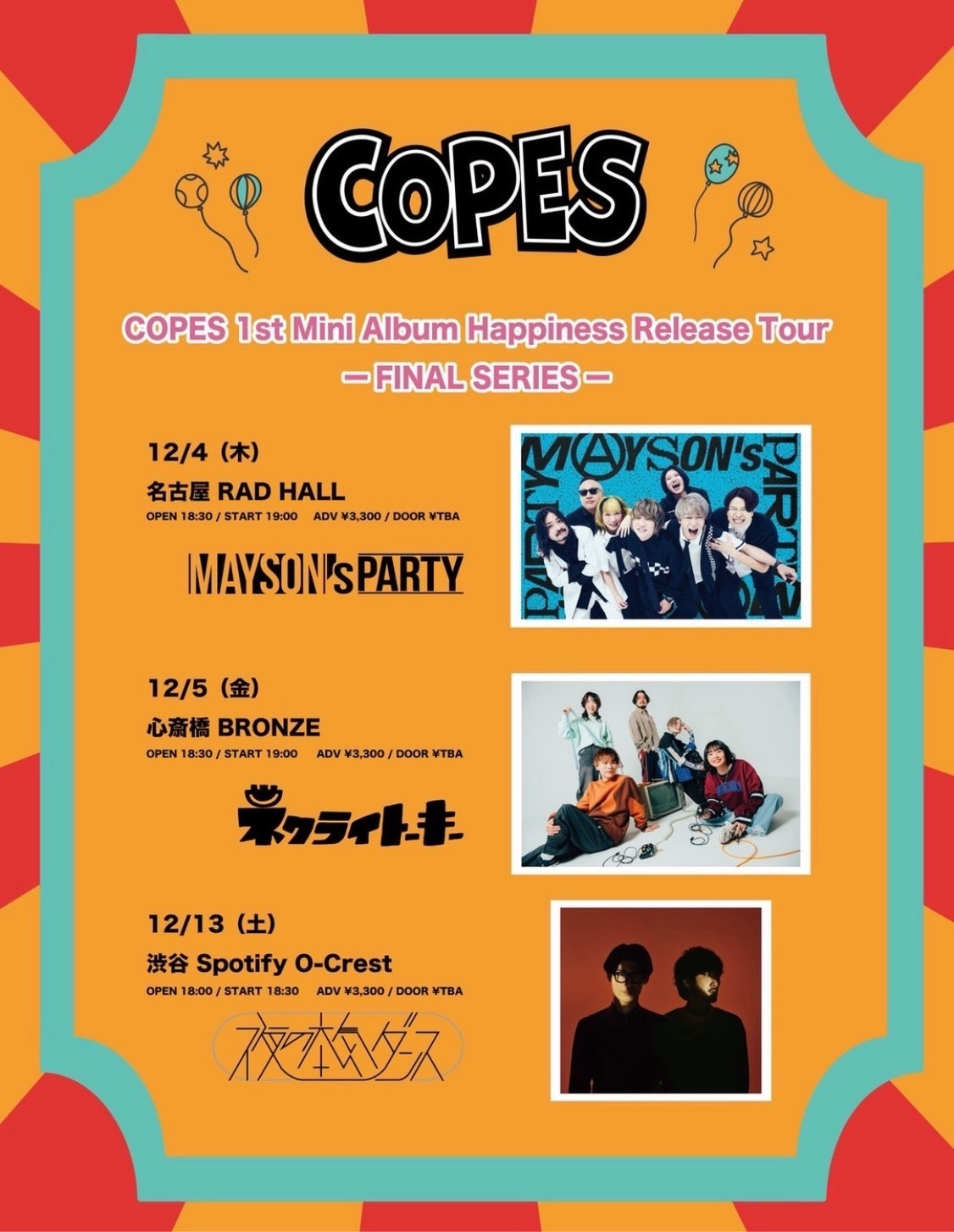 【新規公演】12⽉13日(土) Spotify O-Crest COPES「Happiness」 Release Tour 2025.09.21 NEWS LIVE COPES「Happiness」 Release Tour【 開催日時 】2025年12⽉13日(土)開場 18:00 / 開演 18:30【 開催場所 】Spotify O-Crest【 出演 】 COPES / 夜の本気ダンス【 チケット 】前売 ¥3,300 + 1Dチケットぴあhttps://w.pia.jp/t/copes-hpns-tour/イープラスhttps://eplus.jp/copes-hpns-tour/