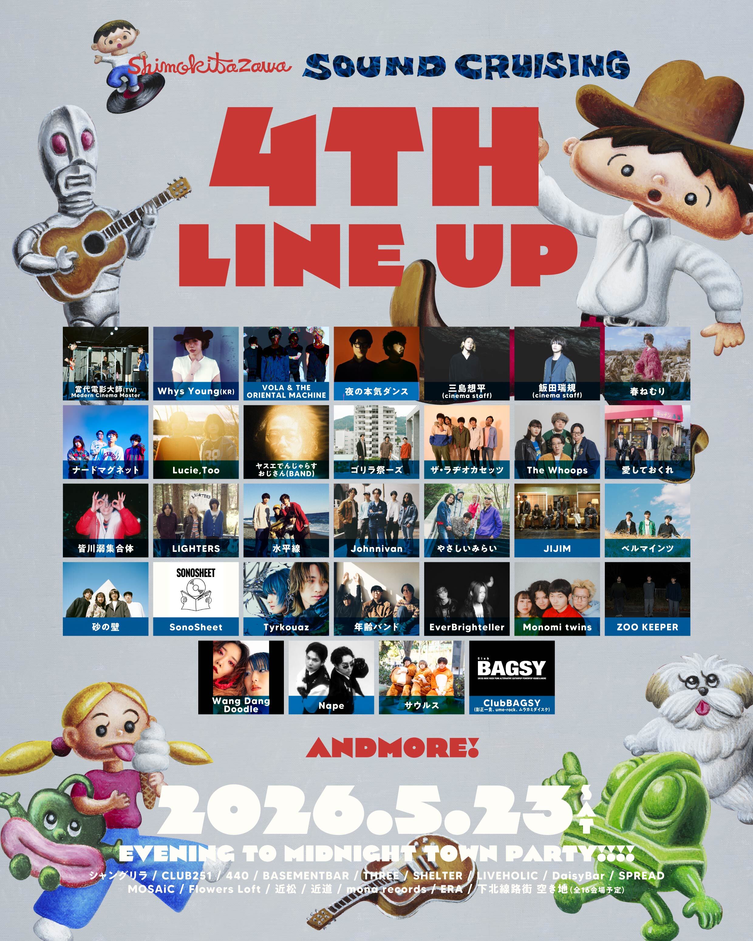 NEW 【新規公演】5/23(土) 「 Shimokitazawa SOUND CRUISING 2026 」 2026.04.16 NEWS 「Shimokitazawa SOUND CRUISING 2026」【 開催日時 】2026年5⽉23日(土) DAY 11:00-22:00 / NIGHT 22:00-29:00【 開催場所 】 下北沢エリア ライブハウス16会場【 出演 】 出演者に関しましてはイベント公式HPをご覧ください 【 チケット 】 ■先行4次チケット(先着) ONE DAY ¥7,300 (SSC2026オリジナルグッズ付) DAY TIME ¥6,000 NIGHT TIME ¥3,800 受付期間:〜5/8(金)23:59まで https://fanlink.tv/ssc2026