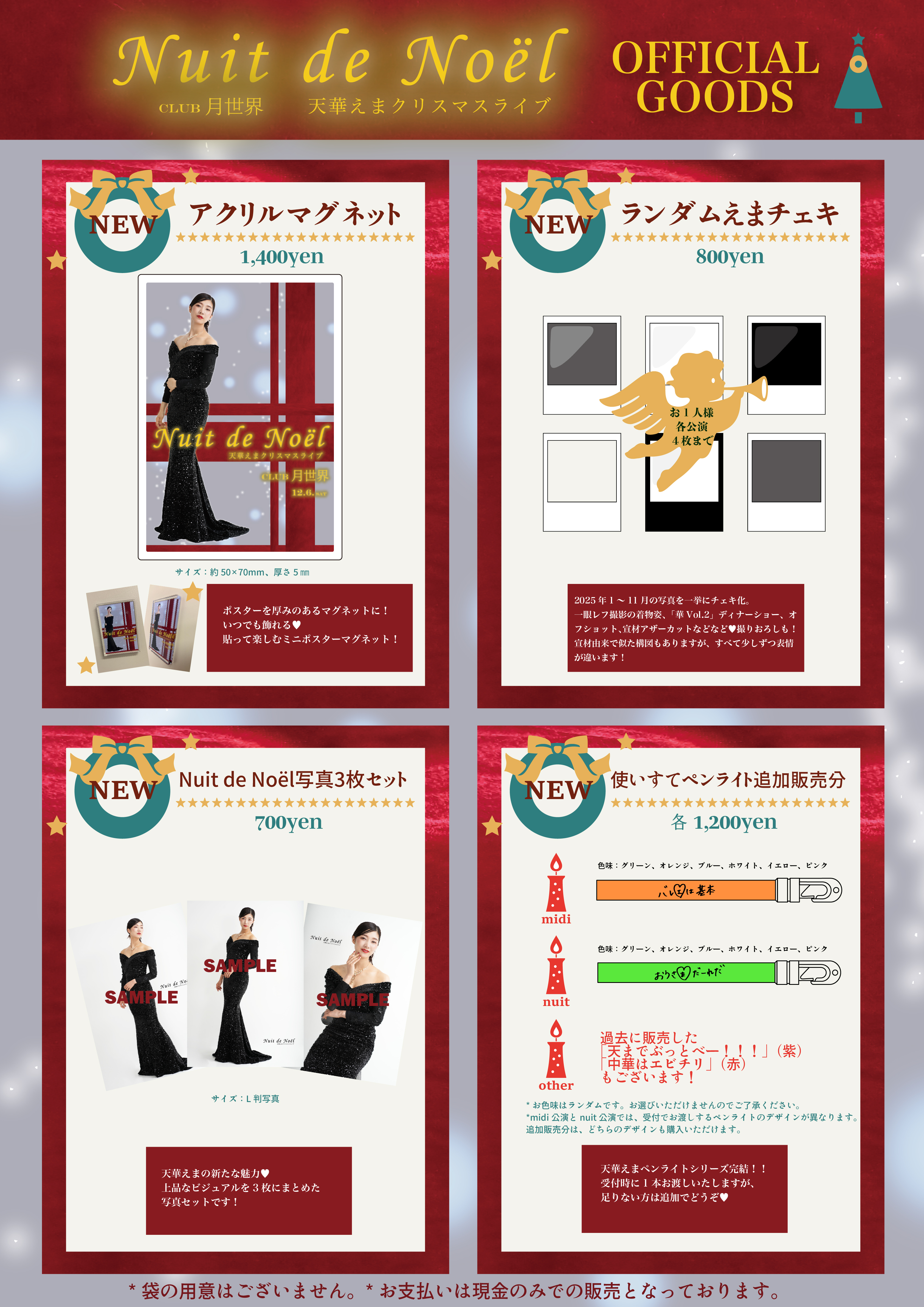 12月6日(土)天華えまクリスマスショー「Nuit de Noël」にご来場される皆様へのお知らせです。 【midi公演】 【nuit公演】 ●入場について ●受付について 【各プレイガイドにてご購入の方】 【共通】 midi公演ペンライト文言:「バレエは基本」 *ペンライトの色はランダムでお配りします。お選びいただけませんのでご了承ください。 ●グッズ販売について 【新グッズ】 【既存グッズ】 ●公演について ●お手紙・プレゼントについて ・ナマモノ(冷蔵・冷凍が必要なもの、植物、生物など)