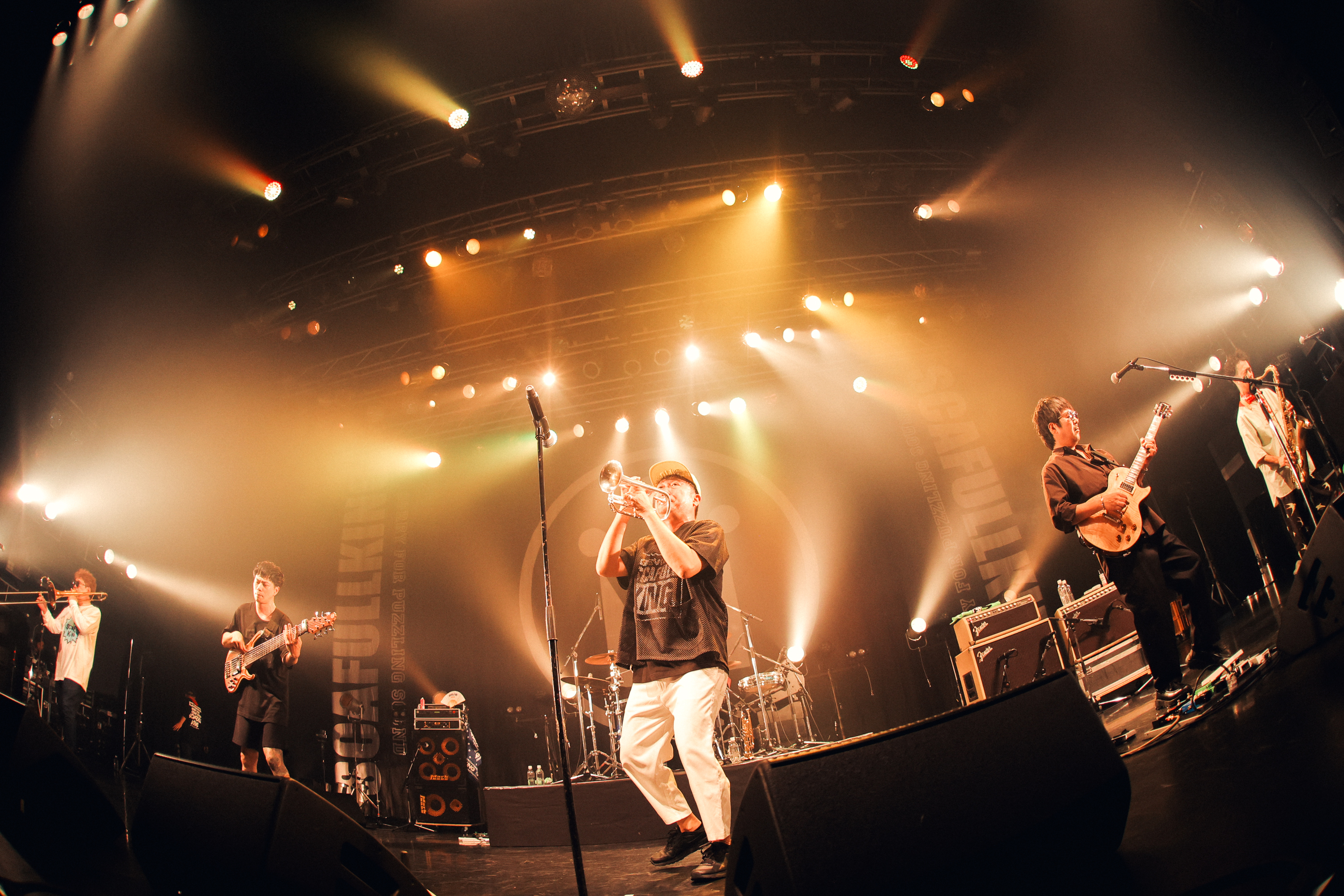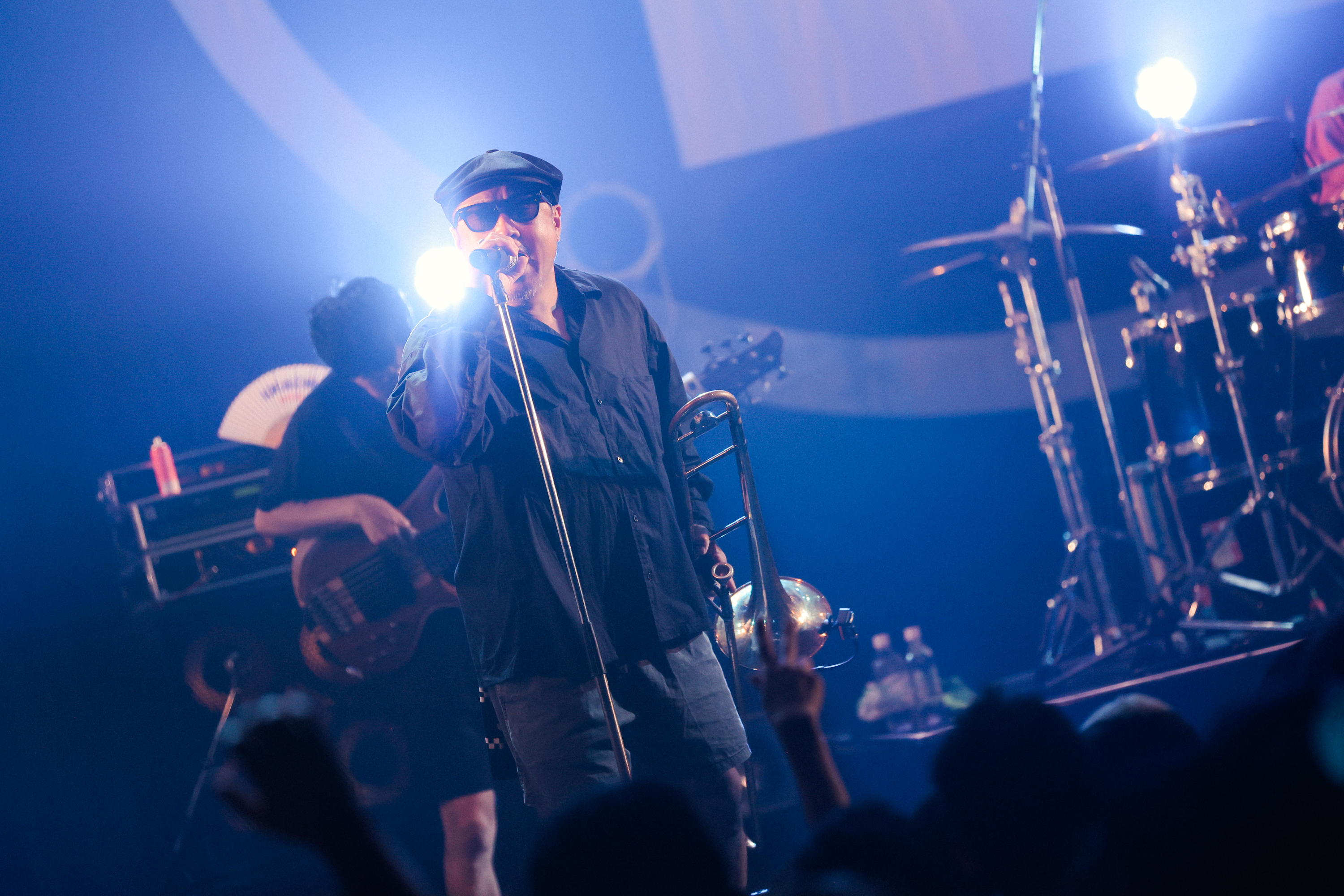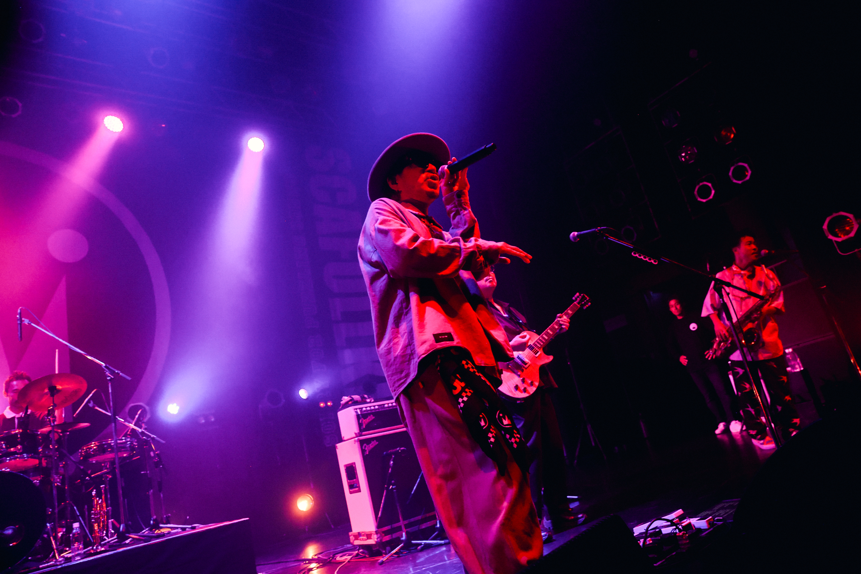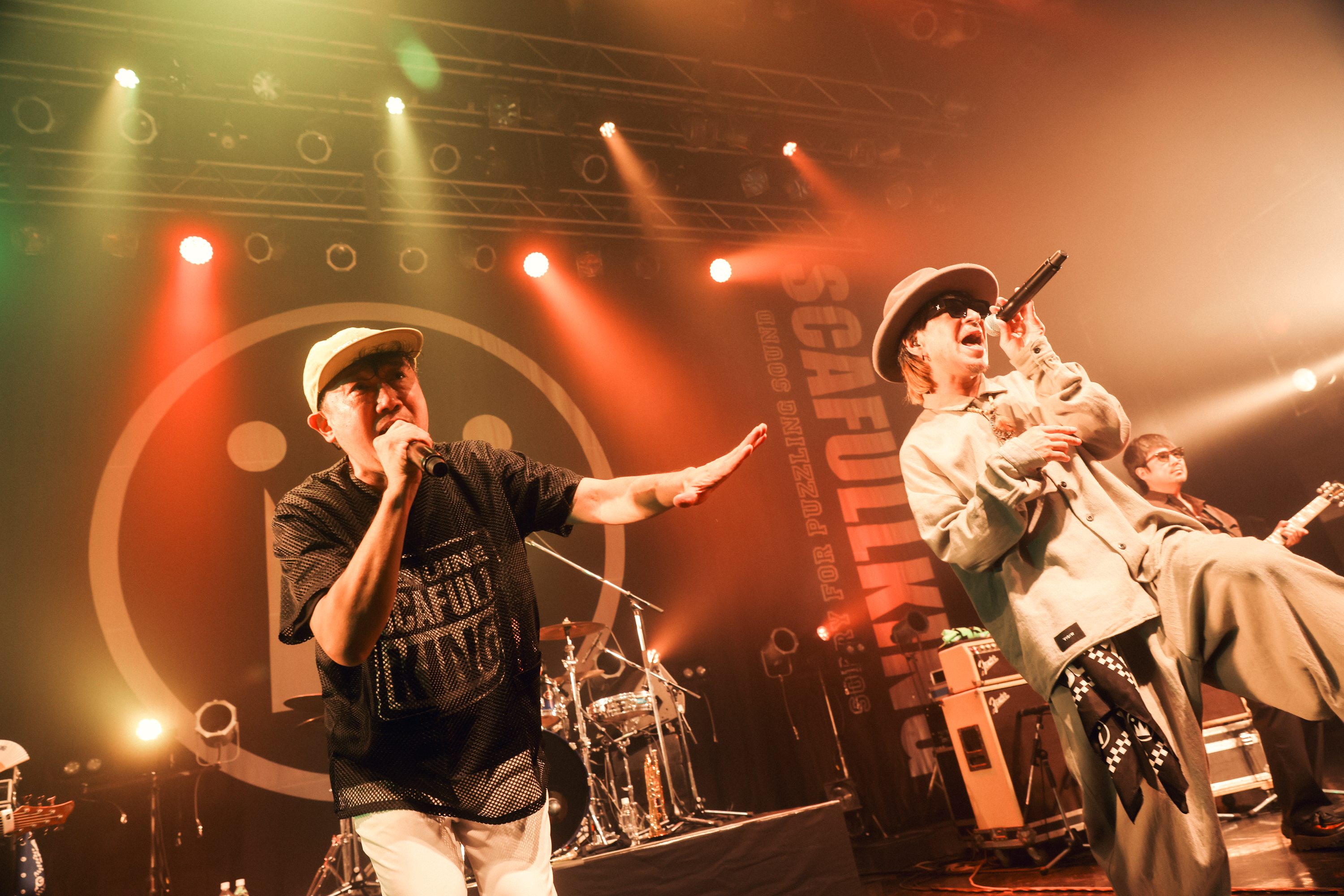 さらにこの中盤はゲストも登場。まずはファンキーな「Greatest Sounds」のグルーヴに乗って登場したのは、SCAFULL KINGを語る上では欠かせないLOW IQ 01。ゆっくりとステージ袖から表れたLOW IQ 01は、ファットなバンドアンサンブルにうねりを起こし、さらに華やかに色づけていく。盛大な歓声が巻き起こるなか、間髪入れずにLOW IQ 01の「Never shout up(SKA ver)」へとなだれ込んで美声を響かせるとフロアは祭りの晴れやかさだ。