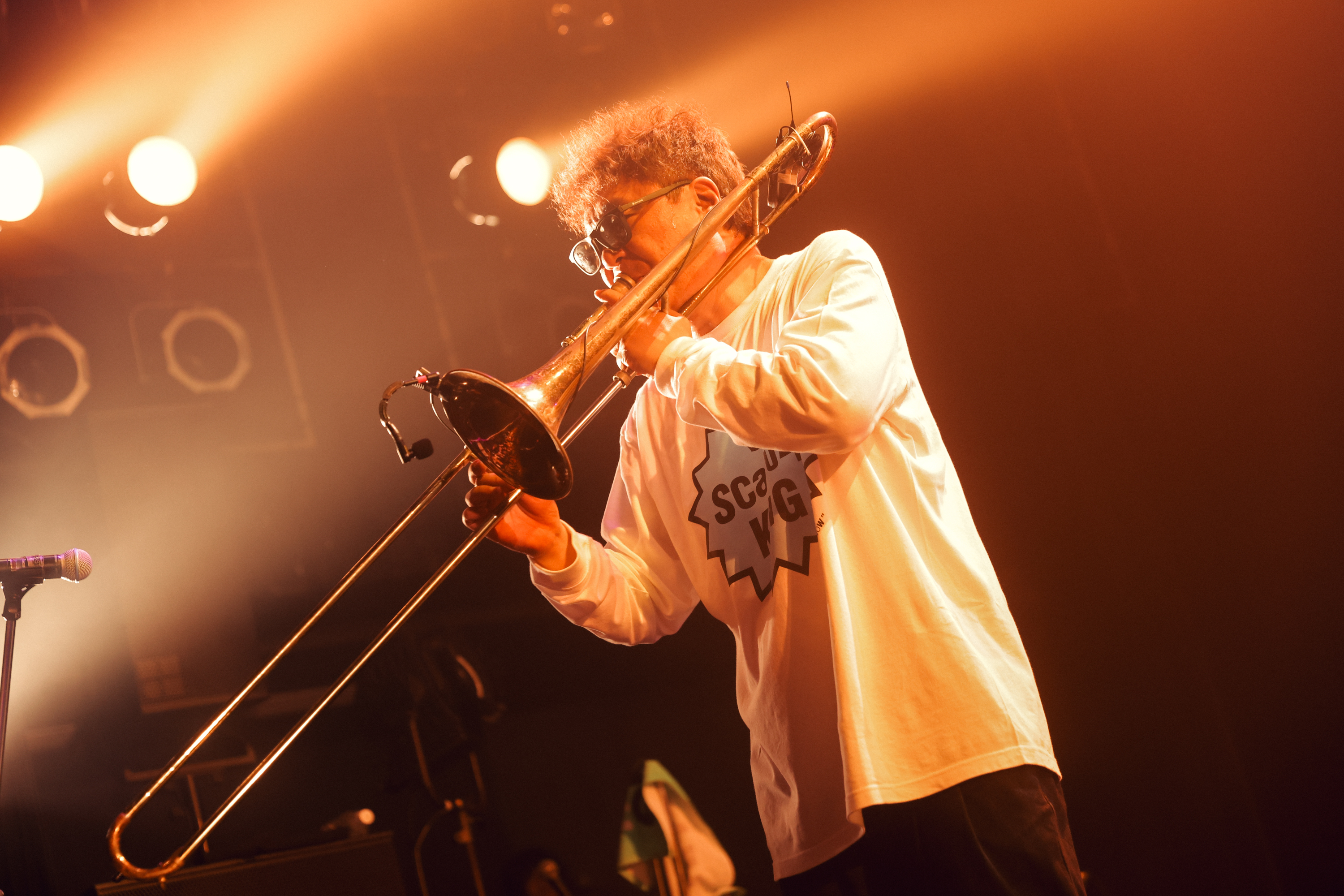 パワフルなSYUTA-LOW”TGMX”TAGAMI(Vo/Tp)の歌が会場内の温度をグイグイと上げるステージは、早くもクライマックスかという盛り上がりで、観客のシンガロングやかけ声もフルボリュームだ。
