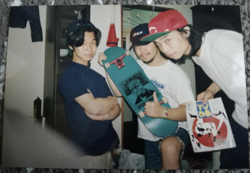 ▲1992年頃。3人写真の真ん中でスケボーを持っているのが大ちゃん(NOBODYS / THE DUDOOS)。