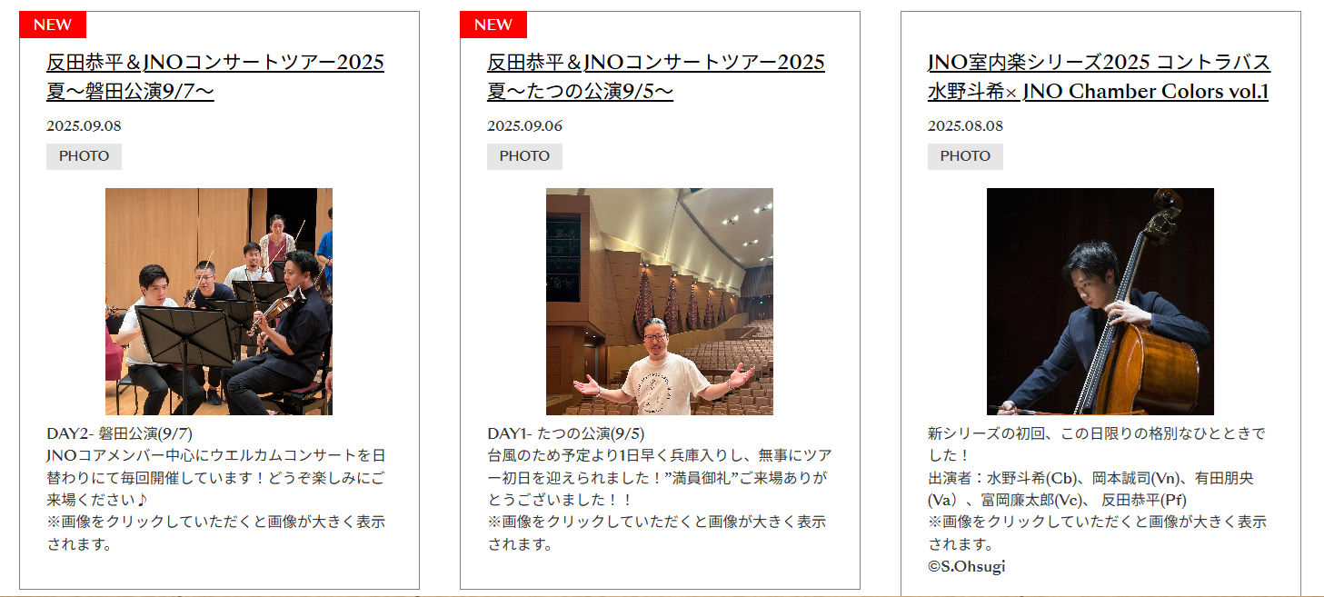 【PHOTO】新着画像を公開!反田恭平&JNOコンサート夏ツアー2025(9/18更新) 2025.09.18 NEWS JNOコンサート夏ツアー2025が始まりました!同行スタッフ撮影の舞台裏やオフショットなどをお届けいたします! 夏ツアーの様子、どうぞお楽しみください!最新はこちら↓https://fan.pia.jp/solistiade/photo/list/