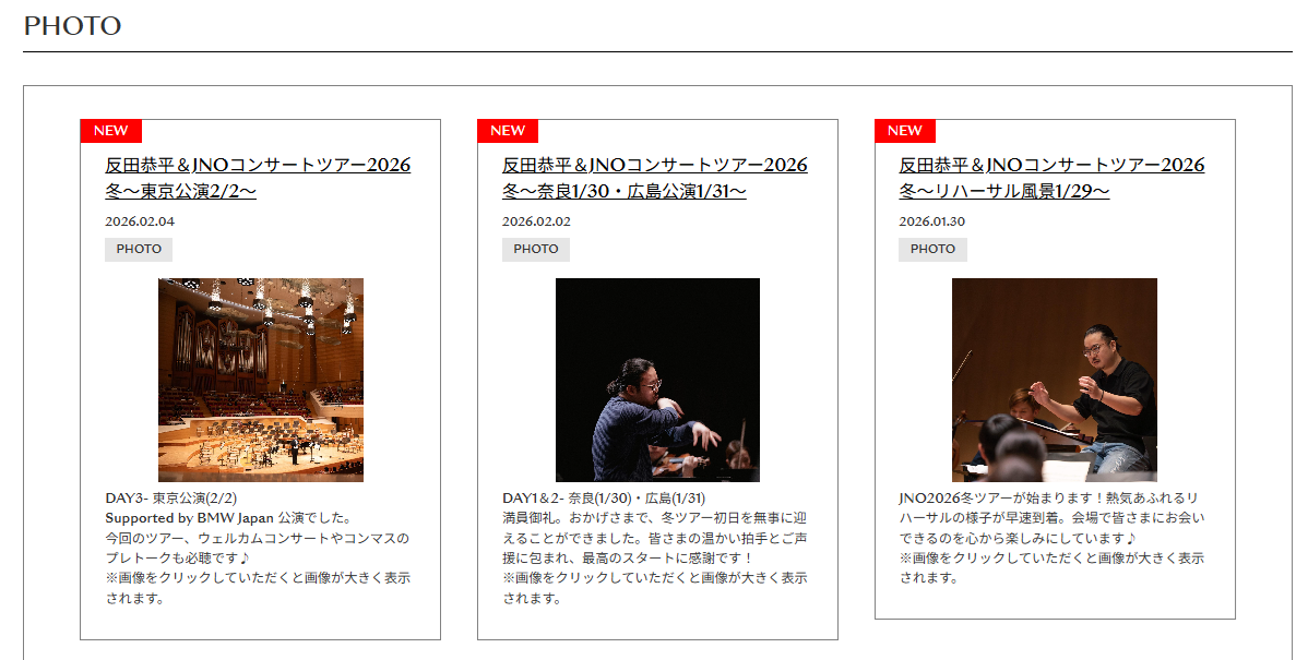 【PHOTO】新着画像を公開!反田恭平&JNOコンサート冬ツアー2026(2/4更新) 2026.02.04 NEWS JNOコンサート冬ツアー2026がいよいよ始まります! リハーサルの様子や公演当日の舞台裏、またメンバーのオフショットなど日々お届けしていきます。多彩な表情を、どうぞお楽しみに♪最新はこちら↓https://fan.pia.jp/solistiade/photo/list/