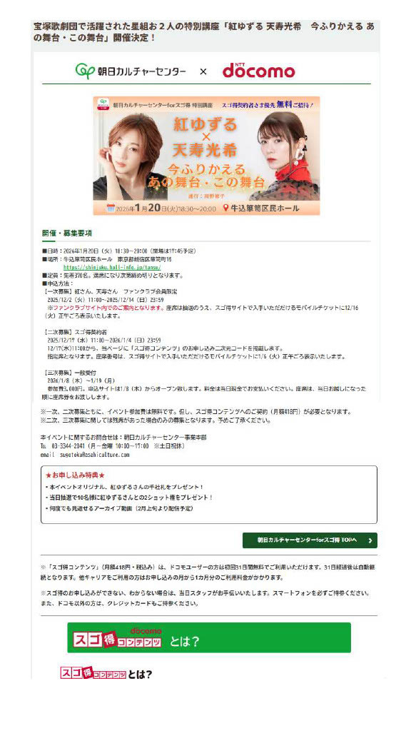 NEW 【EVENT】2026年1月20日 朝日カルチャーセンターforスゴ得の特別講座出演 2025.11.17 News INFORMATION 2026年1月20日(火) 朝日カルチャーセンターforスゴ得の特別講座「紅ゆずる 天寿光希 今ふりかえるあの舞台・この舞台」開催決定!